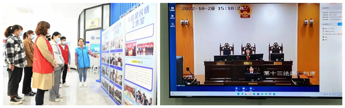 这两张照片体现了法院与辖区各街道“双派驻”工作机制。一、审判力量“走出去”。法院定期派驻法官进入各街道开展诉讼延伸工作。二、调解力量“请进来”。街道定期派驻人民调解员至法院就地调解辖区纠纷。三、诉调对接“畅起来”。调解成功及时司法确认,调解不成及时受理。今年以来,我院法官进驻钟楼区8个街道(镇)的21个社区,法官、调解员相互派驻200余人次,化解了某健身房服务合同、某生鲜菜场租赁合同等群体性纠纷。