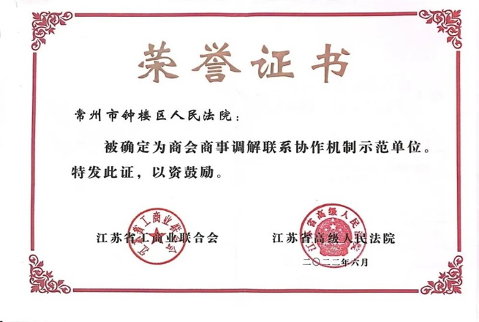 这是钟楼法院获评商会商事调解联系协作机制省级示范单位的荣誉证书,我院也是全市唯一获此荣誉的基层法院,体现了商事纠纷多元化解机制。一、让“商人”靠“商会”。构建“商会调解+司法确认”模式推动商事纠纷多元化解。二、从“单一”到“多元”。与相关单位、行业对接,统筹资源、联合发力。三、以“专业”促“共赢”。吸纳专业人才进入调解员队伍,精准对接解纷。目前商会调解员7人,今年以来共参与102件商事案件调解。