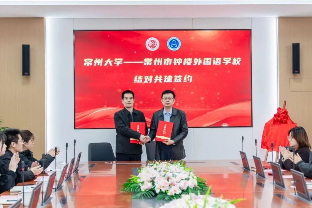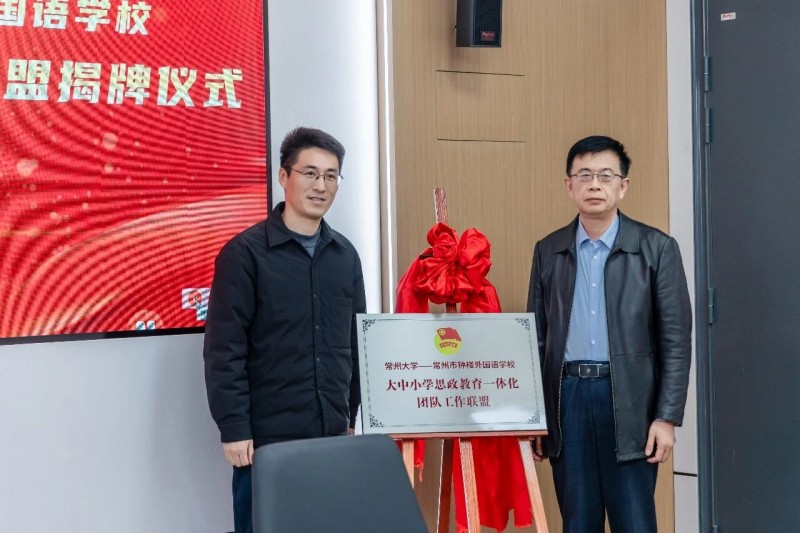 会上,校团委相关负责人详细介绍了结对共建的背景与实施方案,阐明了两校将在思想政治教育、实践育人、资源互补等方面开展深度合作,推动党、团、队育人链条与大中小学思想政治教育一体化建设深度融合。在与会领导的共同见证下,常州大学团委与常州市钟楼外国语学校签署了结对共建协议,并共同为“思政教育一体化团队工作联盟”揭牌,标志着两校协同育人机制正式建立,开启了高等教育与基础教育融合发展新篇章。