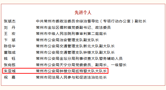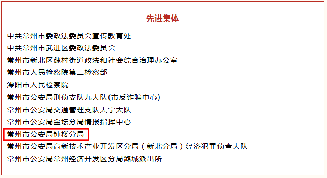 近日,中共常州市委、常州市人民政府印发《关于表彰2025年度全市推动高质量发展先进集体和先进个人的决定》,对全市先进典型予以隆重表彰。全市政法系统共有11个集体、10名个人获表彰,其中常州市公安局钟楼分局1个集体、 1名个人榜上有名,充分彰显了分局服务中心大局、护航高质量发展的政治担当与奋进姿态。